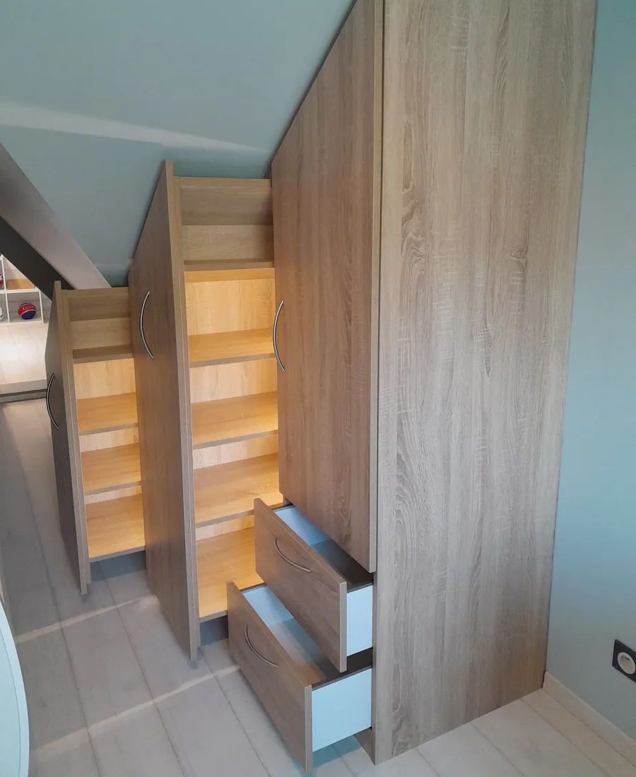 Nous créons des dressings pratiques et esthétiques, optimisés pour vos espaces. Rangements sur mesure, tiroirs, penderies : tout est pensé pour votre quotidien.